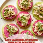 To veganize, swap the tuna with smashed chickpeas or mashed white beans and use vegan mayo. The watermelon radish still provides a wonderful crunch and color, making it a fresh plant-based appetizer.